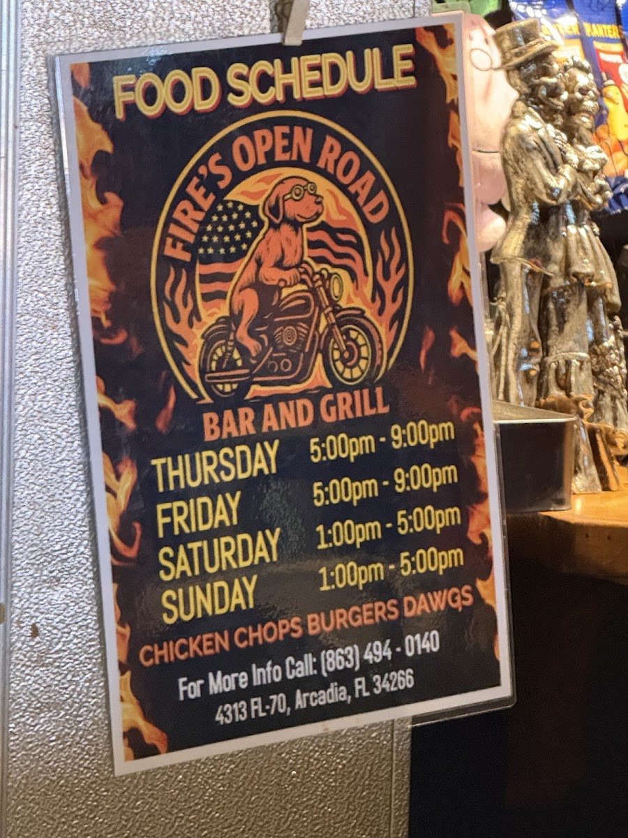 The menu at Fire's Open Road Bar and Grill reflects the straightforward, welcoming vibe of a classic bar and grill. It offers a range of hearty, satisfying dishes alongside comforting drinks designed to complement a relaxed atmosphere, whether you’re dropping in after a long ride or stopping by for a casual meal.